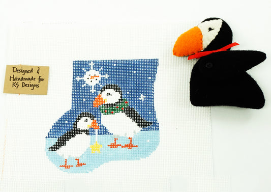Canvas SET ~ Felt Puffin and 2 Puffins 18 mesh Needlepoint Mini Stocking SET by Kathy Schenkel
