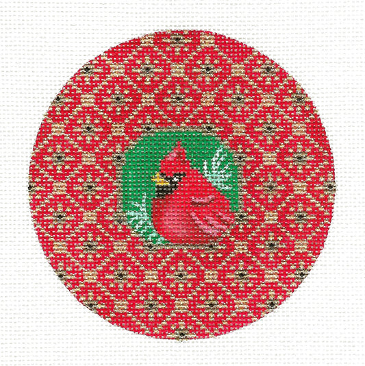 Bird Round ~ Cardinal Bird on a Tapestry Background handpainted Needlepoint Canvas Amanda Lawford