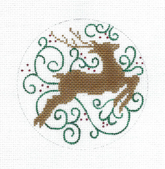 Christmas ~ Golden Reindeer & Filigree 4" Round Ornament handpainted 18m Needlepoint Canvas Amanda Lawford