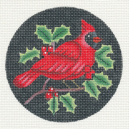 Bird Round ~ Winter Cardinal & Holly 4" Rd. handpainted 18 Mesh Needlepoint Canvas by Amanda Lawford