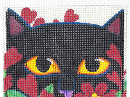 Cat ~ Black Cat with Mysterious Eyes in Flowers handpainted Needlepoint Canvas by Vicky Mount from PLD