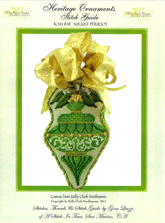 12 Months ~ AUGUST Monthly Peridot & Metallic Gold Ornament & Stitch Guide SET HP Needlepoint Canvas by Kelly Clark