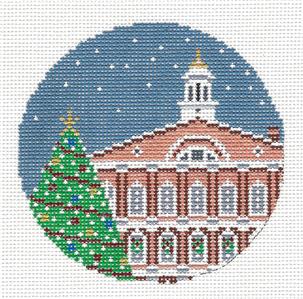 Christmas Travel Round ~ FANEUIL HALL in BOSTON, MA. Christmas Tree handprinted 4" Needlepoint Canvas Needle Crossings