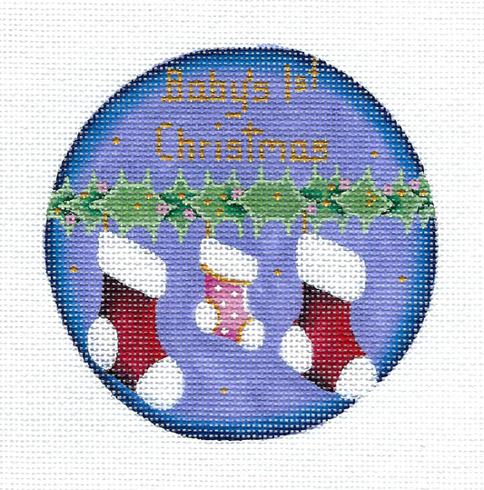 Baby Round ~ Baby's First Christmas Ornament ~ For a Baby BOY or a Baby GIRL ~ handpainted 18 Mesh Needlepoint Canvas by Rebecca Wood