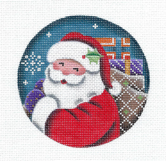 4" Round ~ Santa Down the Chimney 18 Mesh Ornament handpainted Needlepoint Canvas by Rebecca Wood