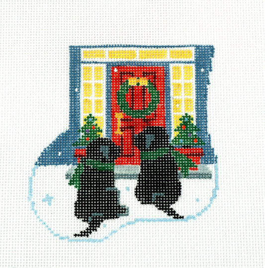 Canvas SET ~ 2 Black Lab Dogs at the Door SET handpainted Needlepoint Mini Stocking & Dog SET by Kathy Schenkel
