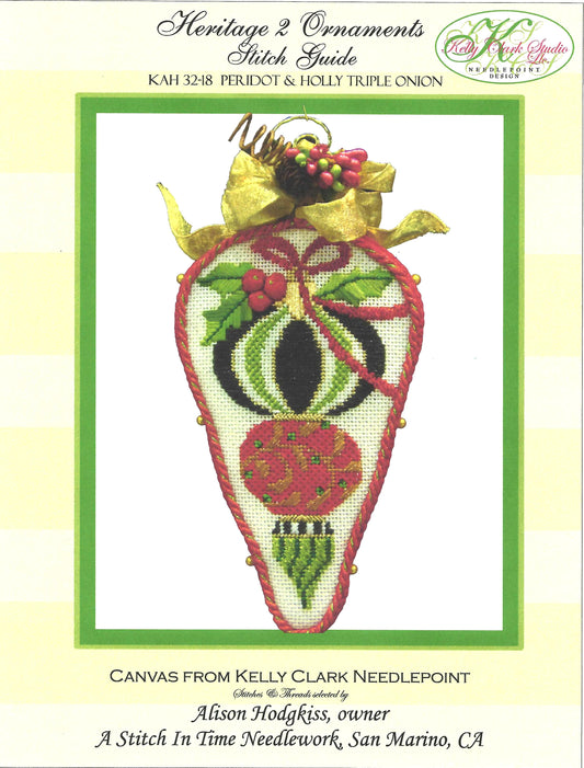 Christmas ~ Peridot Green, Red & Black Triple Onion Ornament with Holly & STITCH GUIDE handpainted Needlepoint Canvas by Kelly Clark