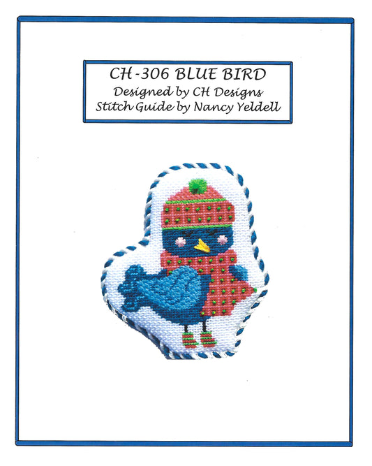 Bird Canvas ~ Blue Bird in a Scarf & Hat & STITCH GUIDE handpainted Needlepoint Canvas by CH Designs -Danji