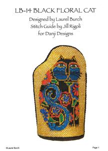 Laurel Burch ~ Handpainted Black Floral Cat & STITCH GUIDE 18 Mesh Needlepoint Canvas from Danji