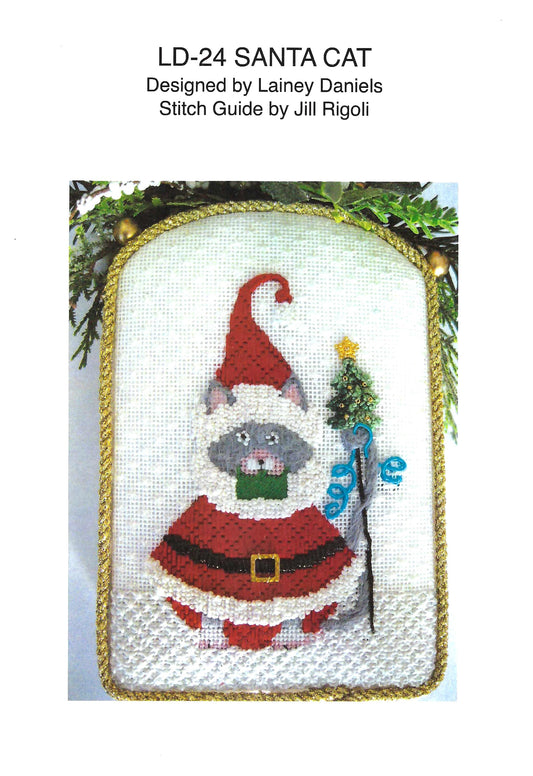 Christmas Cat ~ Santa Cat with Present and STITCH GUIDE handpainted Needlepoint Canvas Ornament by L. Daniels from Danji