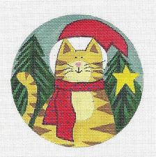 Christmas Cat ~ Marmalade Cat Wearing a Santa Hat 5" Rd. HP needlepoint canvas by Laurie Korsgaden from Danji