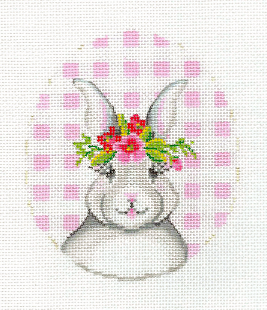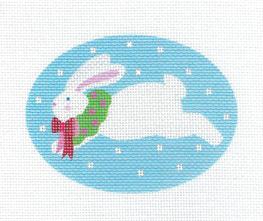 White Bunny Rabbit Wearing a Wreath on Blue 18 mesh handpainted Oval Canvas Needlepoint Ornament by Pepperberry