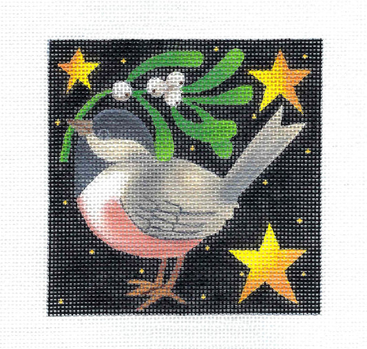 Bird ~ Holiday Chickadee with Mistletoe 4" Square handpainted 18 Mesh Needlepoint Canvas by Maggie