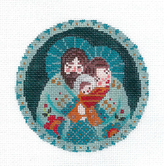Holy Family ~ Mary, Joseph, and Jesus ~ Teal handpainted 18 Mesh 4" Rd. Needlepoint Canvas Ornament by Abigail Cecile
