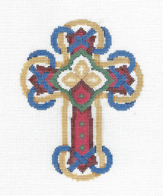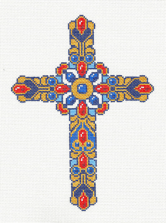 Cross ~ Elegant 7" tall Gold, Blue and Red Jeweled CROSS handpainted18 Mesh Needlepoint Canvas by LEE