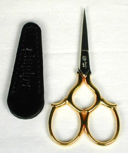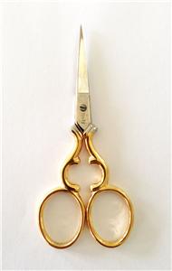 SCISSORS ~ Gingher "Epaulette" Design 3.5" Gold Plated Handles Embroidery Scissors for Needlepoint w/ Leather Case
