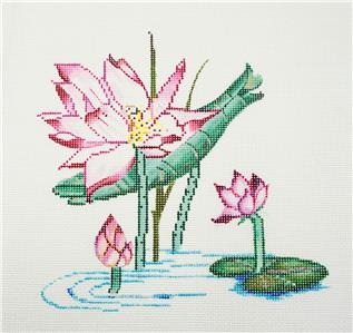 Oriental Canvas ~ " Lotus Blossoms in a Pond " handpainted 13 mesh Needlepoint Canvas by Sophia Designs