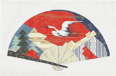 Oriental Fan ~ Oriental Crane in Flight FAN handpainted 18 Mesh Needlepoint Canvas by Sophia Design