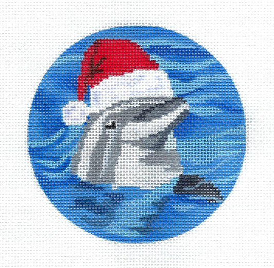 Dolphin in a Santa Hat 4" Round Ornament handpainted 18 Mesh Needlepoint Canvas by Scott Church
