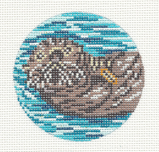 Round ~ Sea Otter with Shell Ornament handpainted 3" Needlepoint Canvas by Needle Crossings