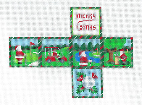 Christmas Cube ~ Golfing with Santa Sports CUBE 3-D Ornament handpainted Needlepoint Canvas by Susan Roberts