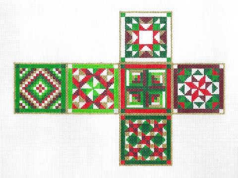 Christmas Cube ~ Christmas Quilt Patches CUBE 3-D Ornament handpainted Needlepoint Canvas by Susan Roberts