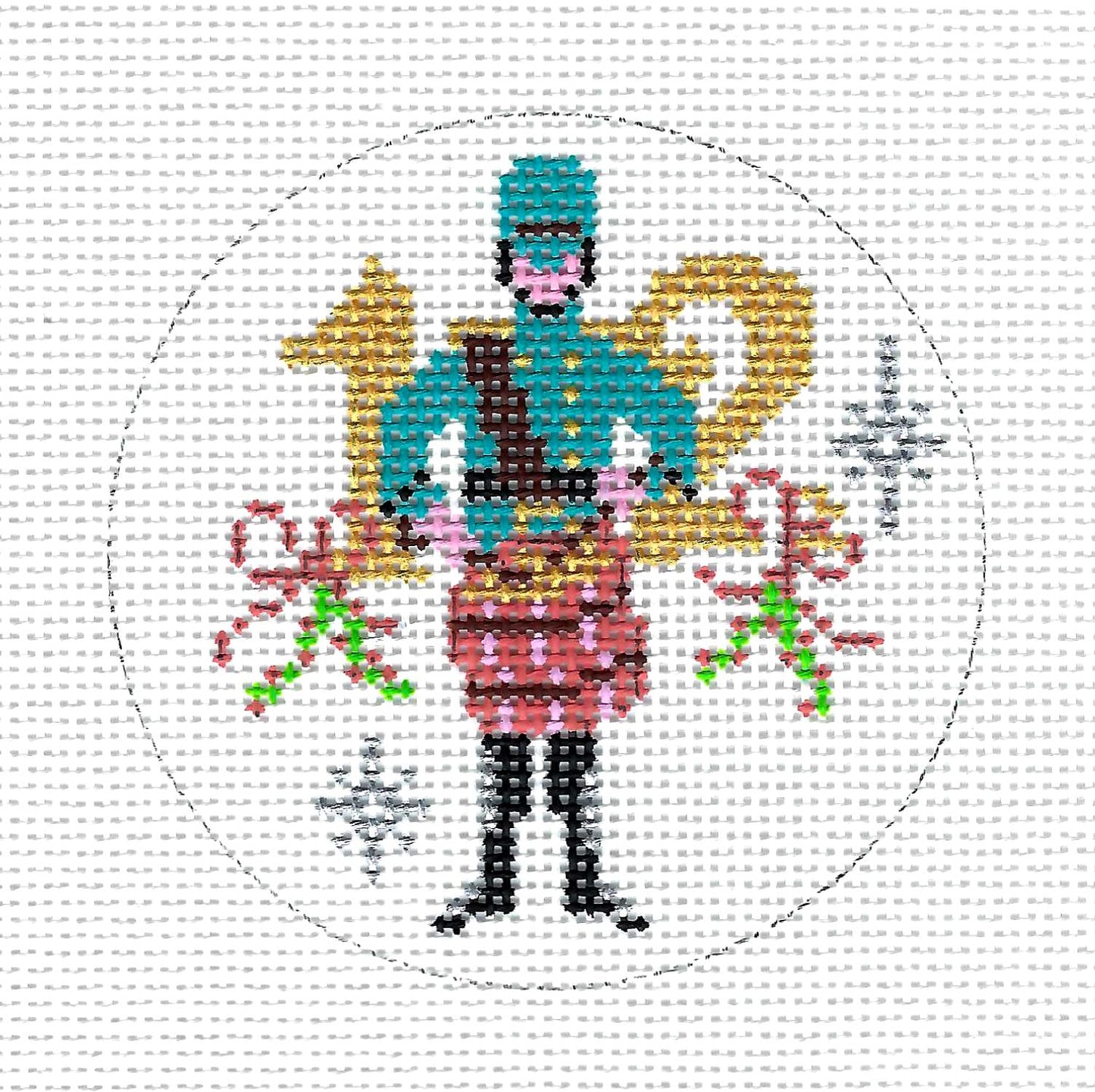 ... handpainted on 13 mesh mono canvas. The stitch painted canvas area is 4" Round with surrounding background canvas of approximately 8.5" by 8.5". Perfect for an Ornament by would be a lovely insert or a framed piece with a background stitched.