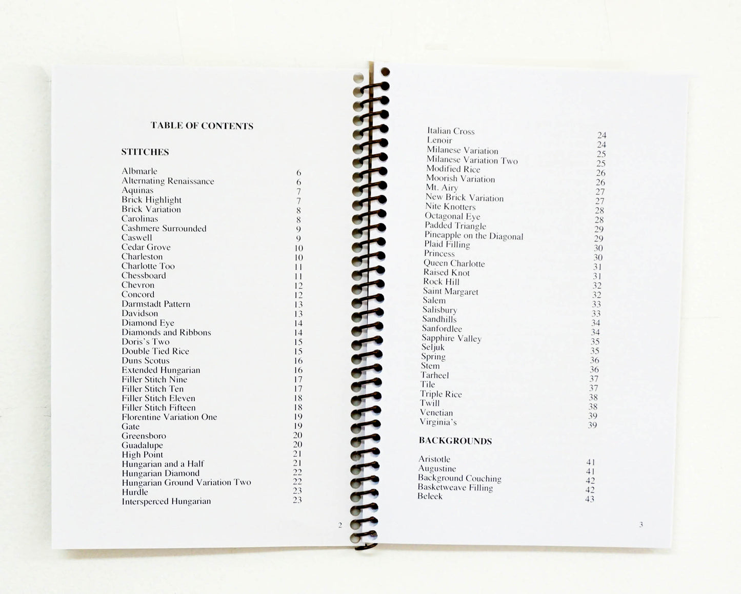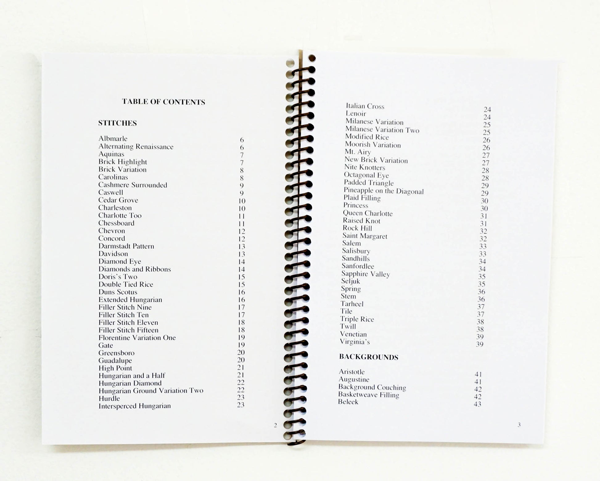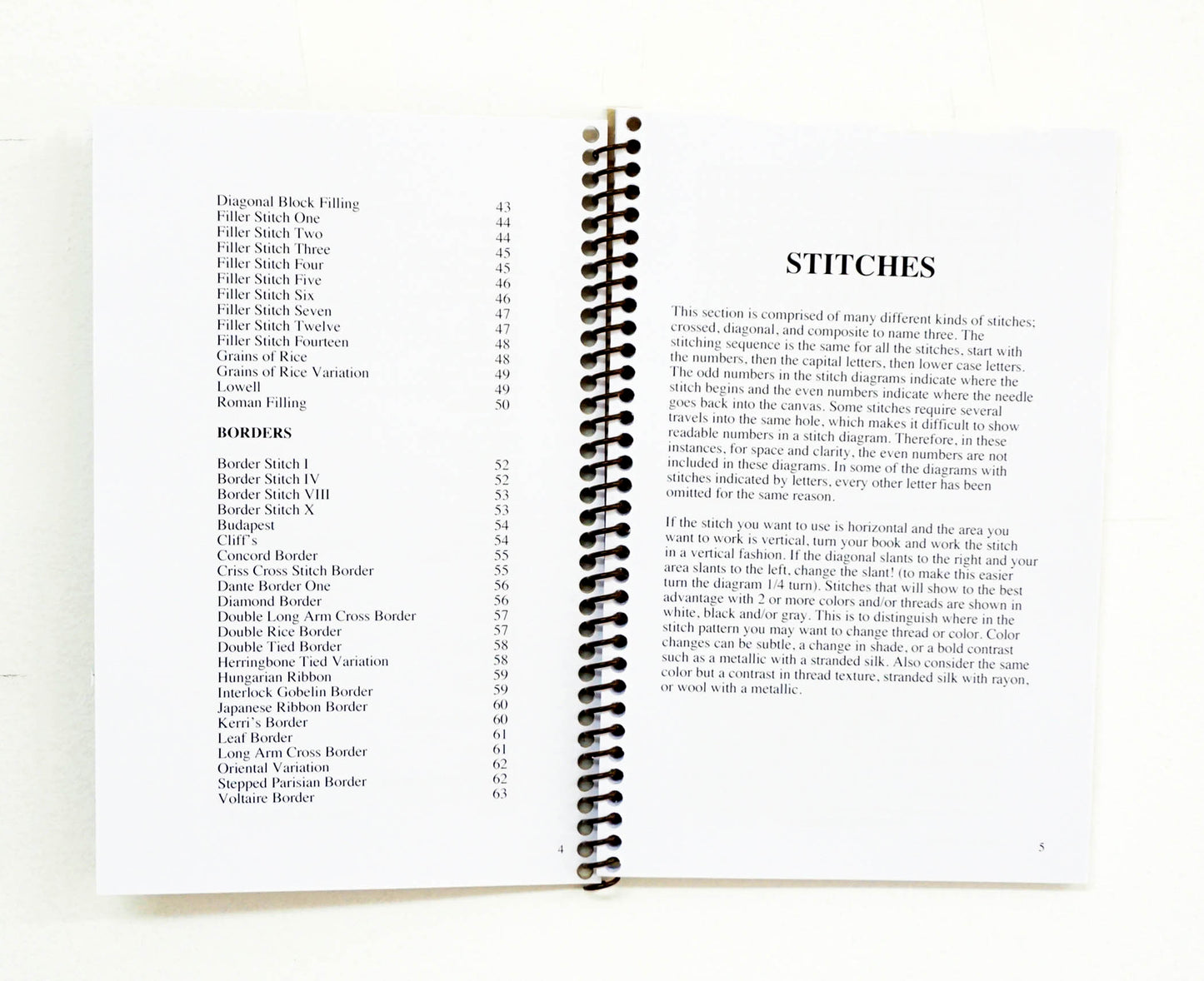 This is a Very Comprehensive, excellent reference manual for all level of stitchers. 8.5" by 5.75" spiral bound, Soft Cover book. Perfect size to take with you !!!!