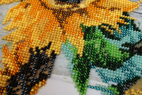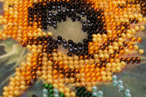 This beautiful large kit called "Flowers of the Sun" contains 11,357 beads in 16 colors, and finishes at approximately 16.9" x 12.5". Each Abris kit comes with everything you will need to make your project; the pattern silk-screened on heavy canvas, all Czech and Japanese glass seed beads, 3 beading needles, and instructions in Russian, Ukrainian and English.