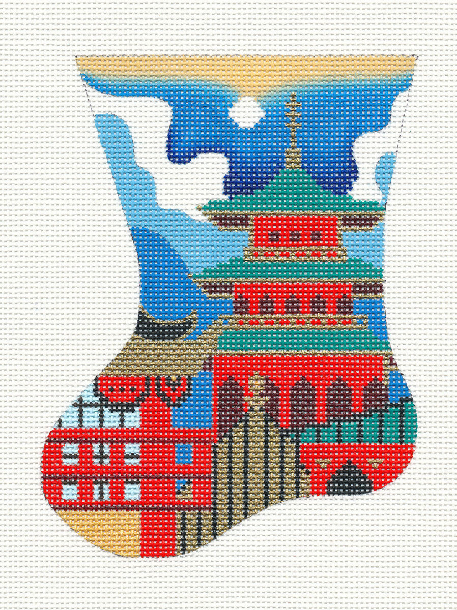 Pagoda Temple Mini Stocking handpainted Needlepoint Ornament Canvas by Amanda Lawford *RETIRED*