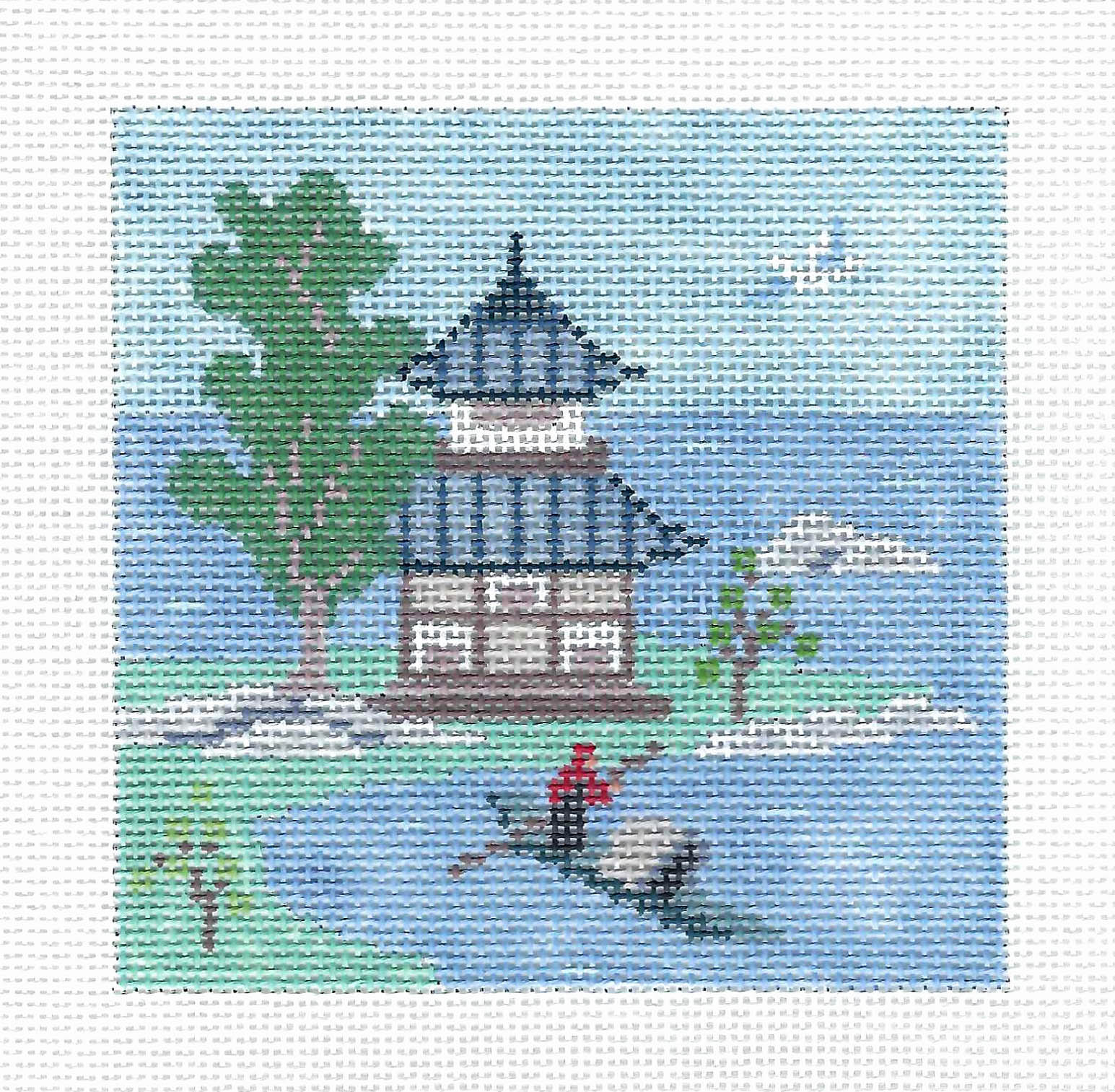 Coaster ~ Pagoda with Boat Oriental 4" Sq. Coaster handpainted Needlepoint Canvas by Susan Roberts