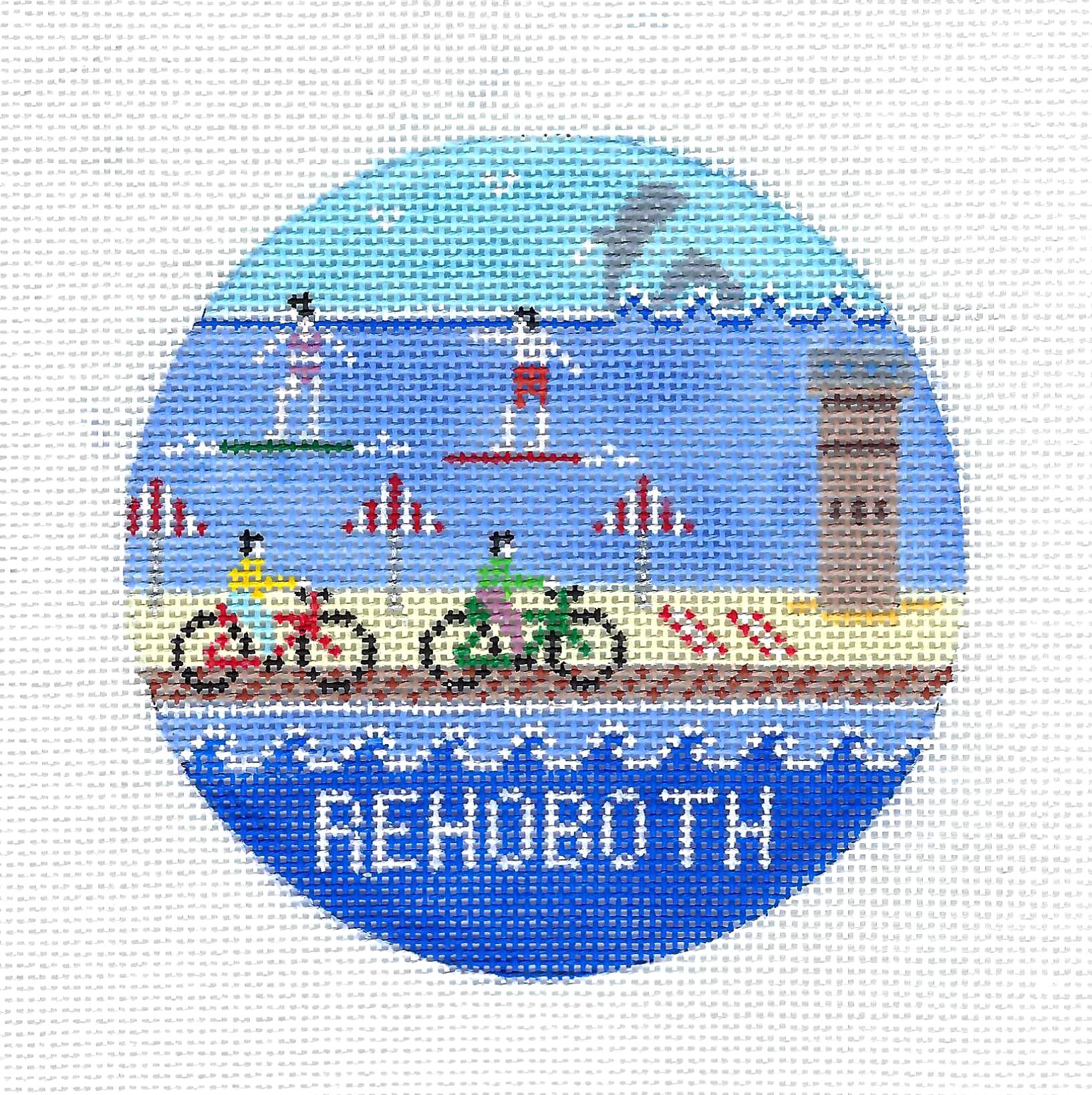 Travel round ~ Rehoboth, Delaware handpainted Needlepoint 4" Rd. Ornament by Doolittle