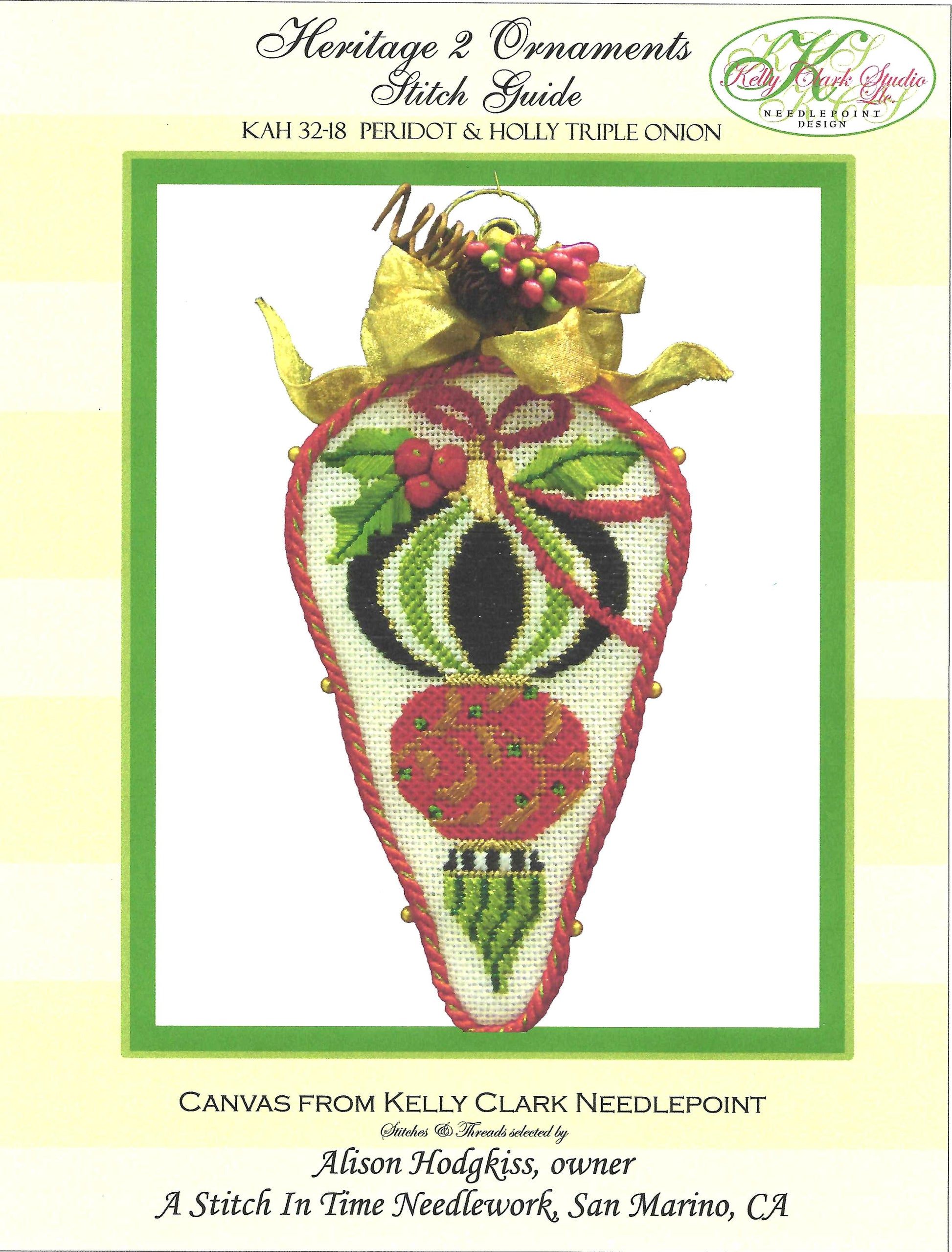 Christmas ~ Peridot Green, Red & Black Triple Onion Ornament with Holly & STITCH GUIDE handpainted Needlepoint Canvas by Kelly Clark