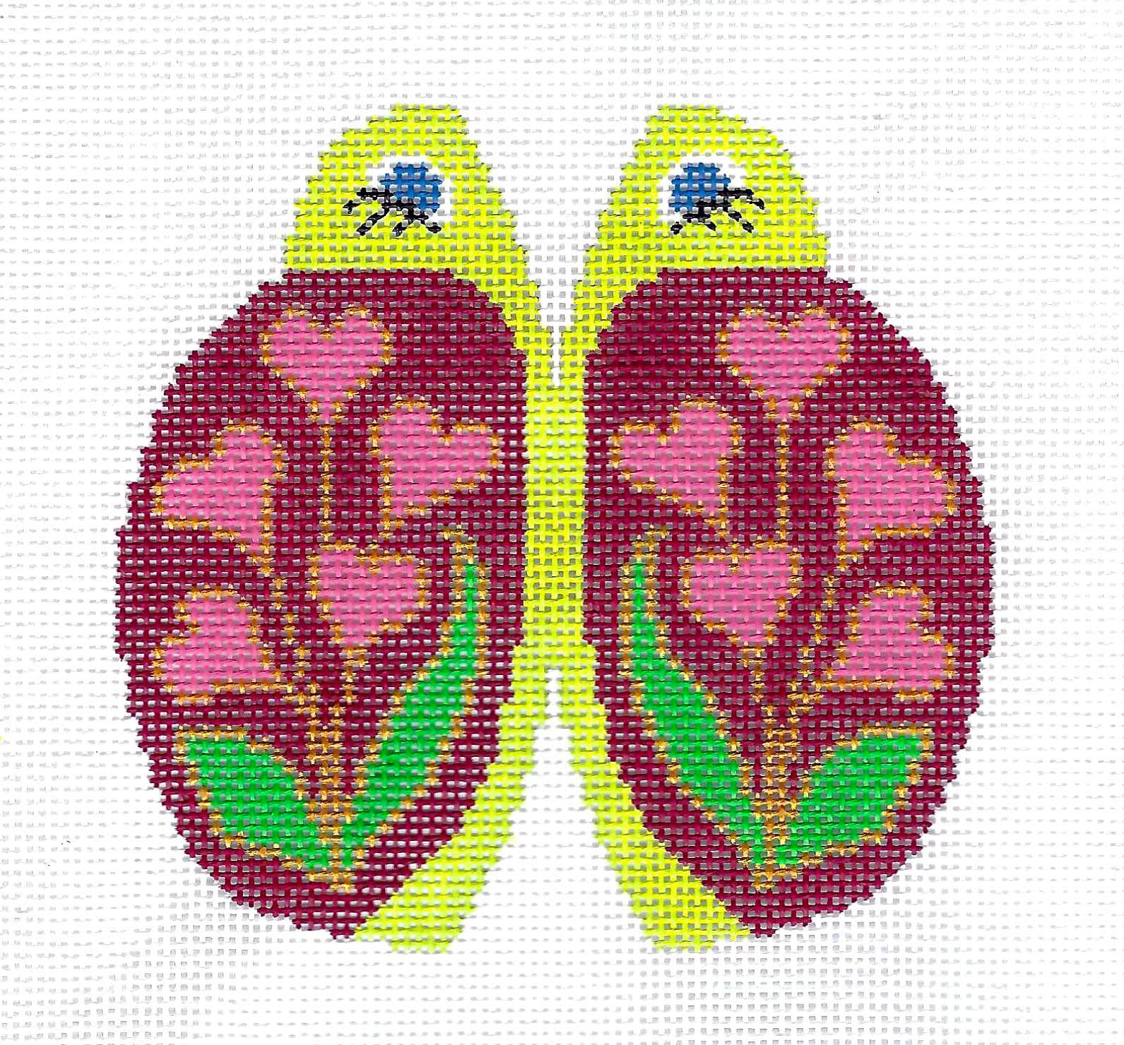... needlepoint canvas, hand painted in bright red, metallic gold and pinks with darling blue eyes with eyelashes! Perfect for a 3-D Soft Sculpture, Frame Weight, Paper Weight, Bean Bag or Padded Ornament.