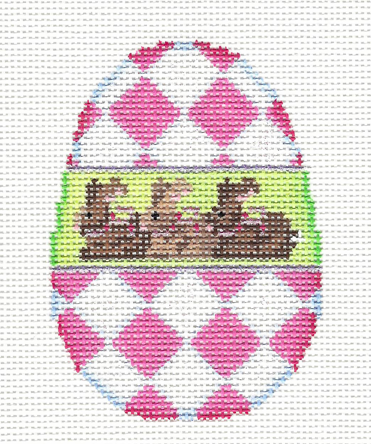 Egg ~ Pink Harlequin Egg & 3 Brown Bunnies handpainted Needlepoint Canvas Ornament by Assoc. Talents