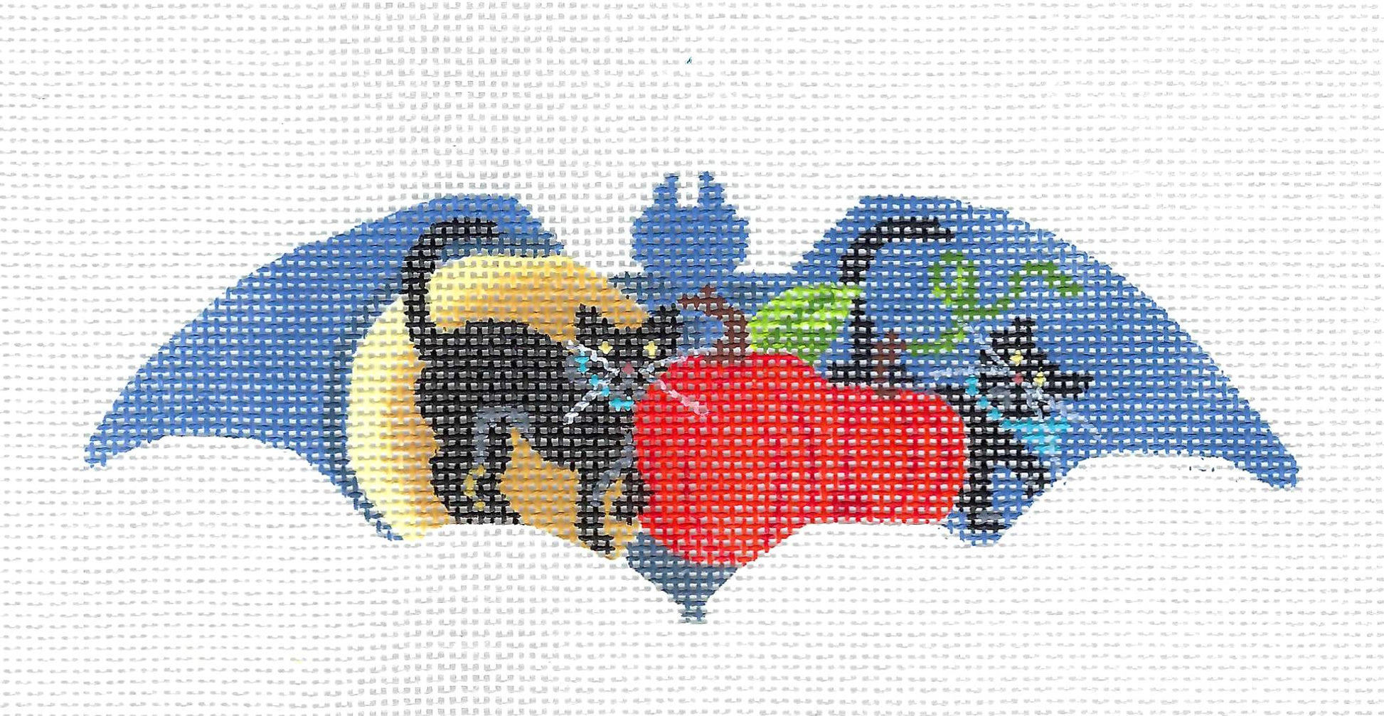 Halloween ~ 2 Black Cats on a Bat handpainted Needlepoint Ornament Canvas by Kelly Clark