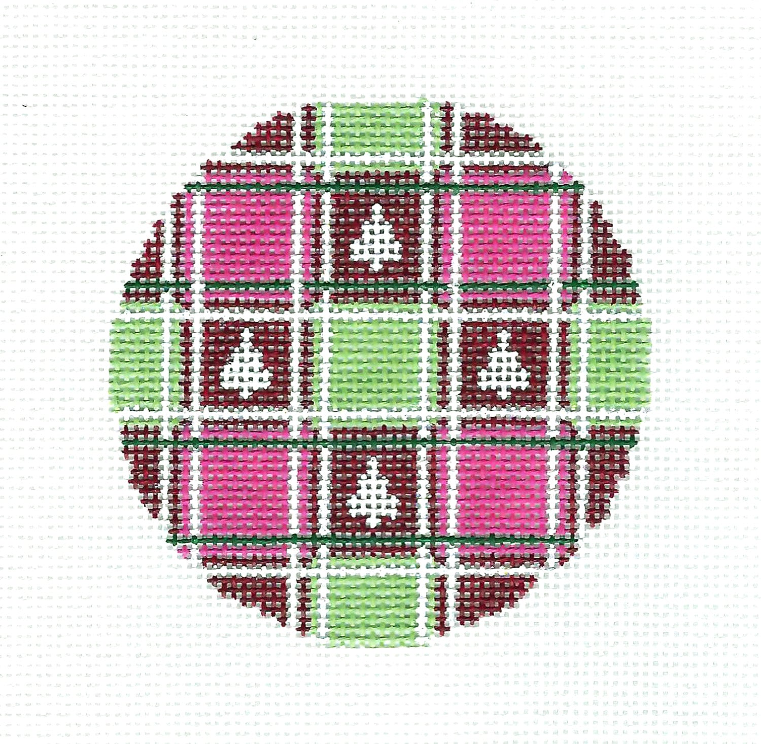 3" Round ~ Cranberry and Green Plaid with White Trees 3" Round Ornament handpainted Needlepoint Canvas by Needle Crossings