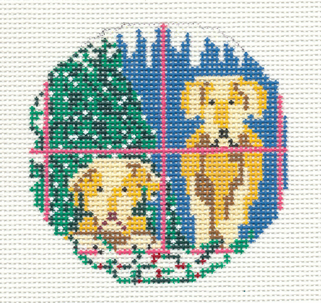 Dog Round ~ 2 Yellow Lab Dogs Ornament 18 mesh handpainted 3" Needlepoint Canvas Needle Crossings