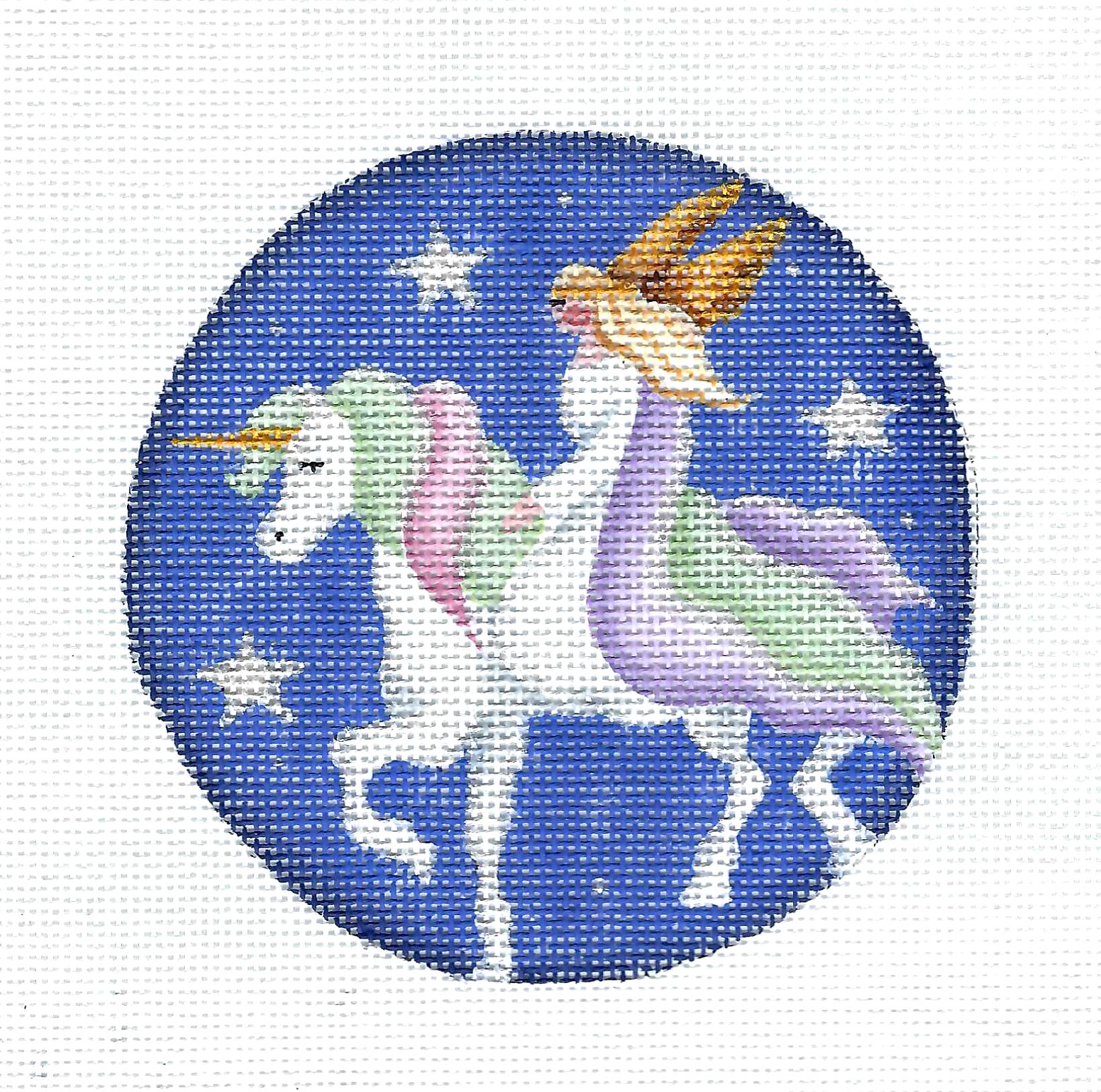 Christmas ~ Angel Riding a Unicorn 4" Rd. Ornament handpainted 18 Mesh Needlepoint Canvas by Rebecca Wood