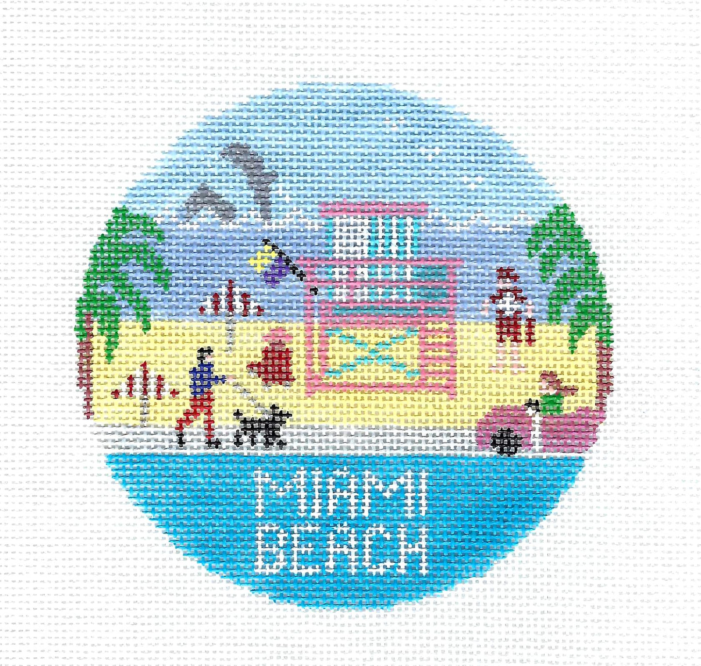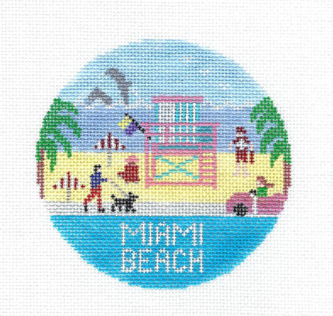 Travel Round ~ Miami Beach, Florida Tropical handpainted Needlepoint canvas 4.25" Rd. Ornament by Doolittle