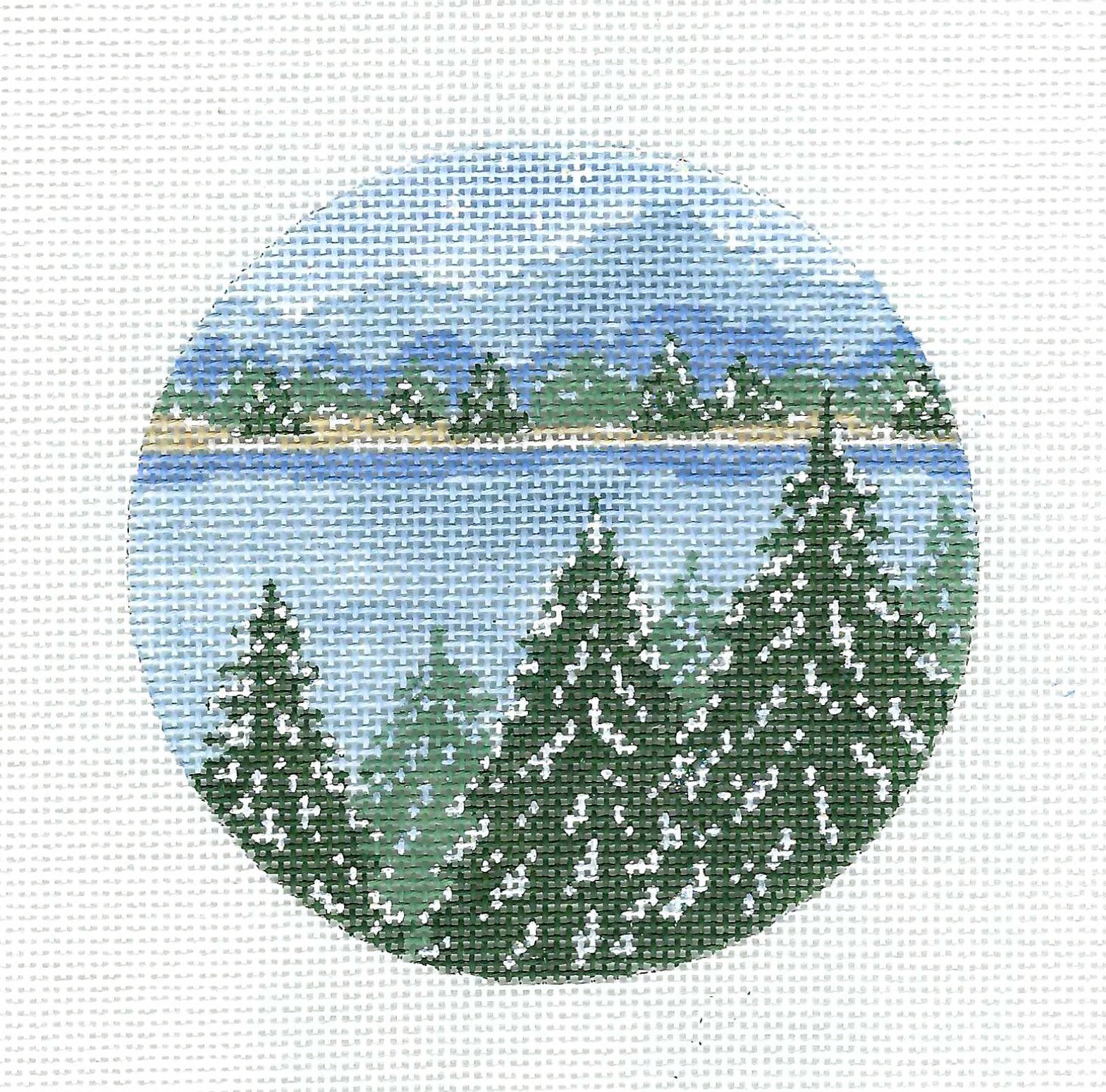 Woodland Forest By the Lake 4" Round handpainted 18 Mesh Needlepoint Canvas by Needle Crossings