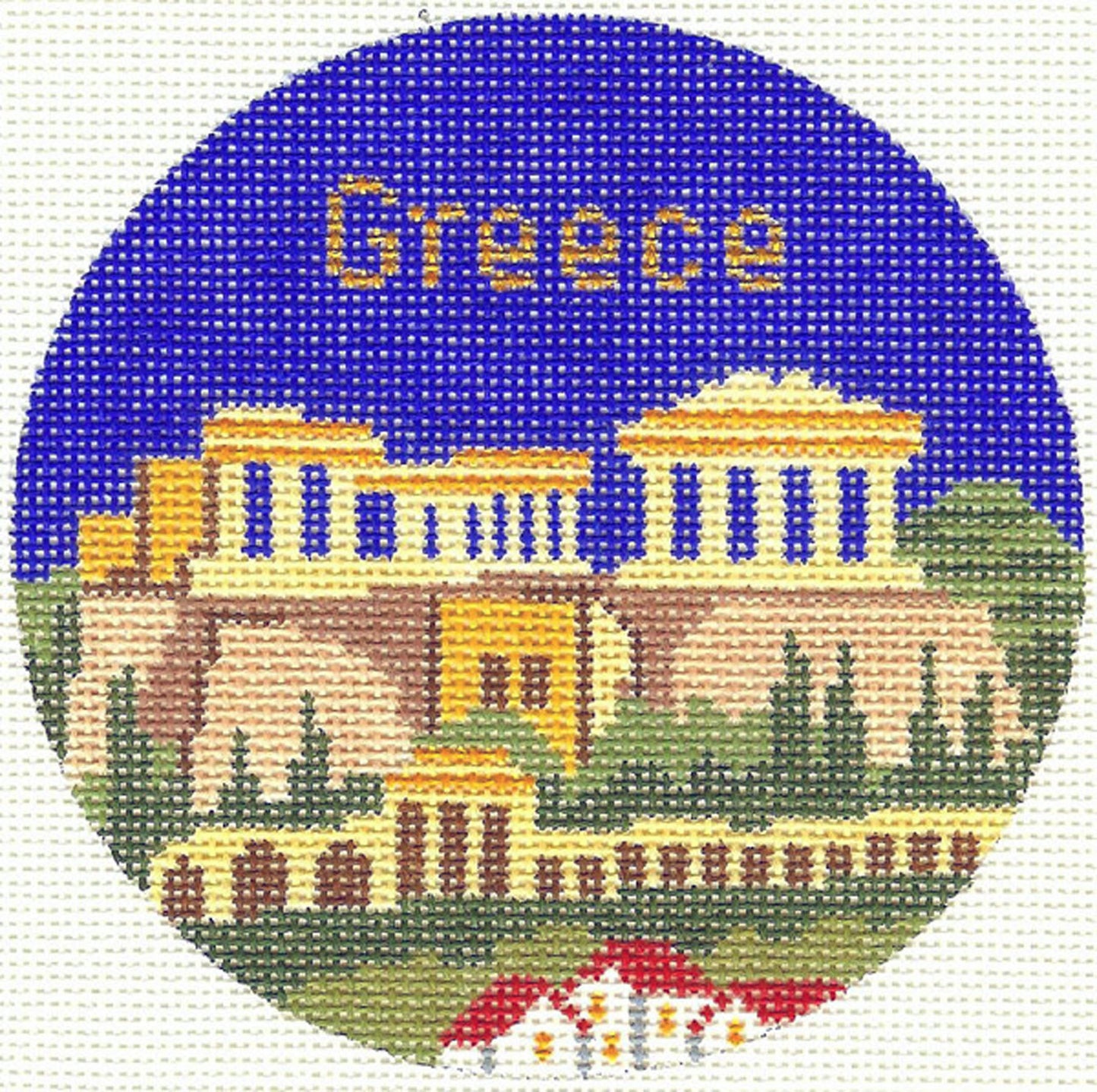 Travel Round ~ GREECE handpainted 18 Mesh 4.25" Needlepoint Ornament Canvas by Silver Needle