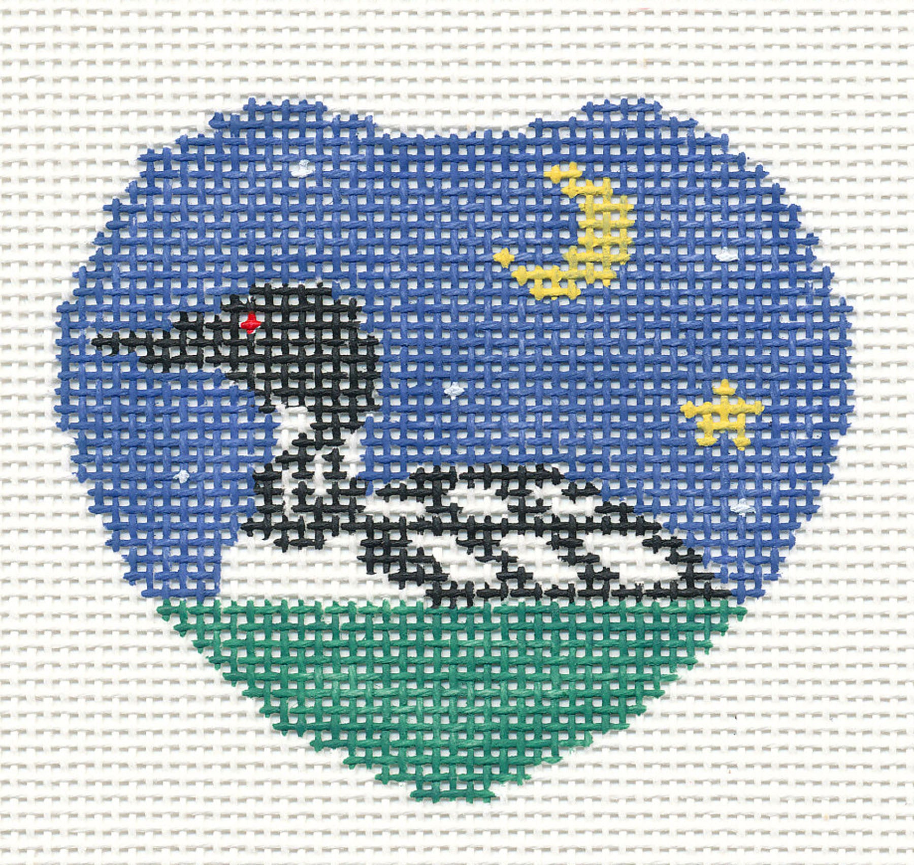 Offered for sale is a lovely Heart Shaped, Loon Bird and Night Sky ~ use either as a Lapel Pin, Coaster or Ornament Design, hand painted on 18 mesh canvas by Kathy Schenkel Designs.