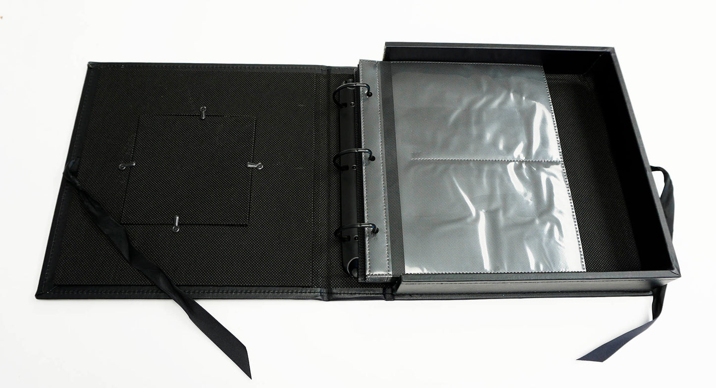 This Premium Black Leather Album measures 9.75" wide by 9.75" long by 2" deep.