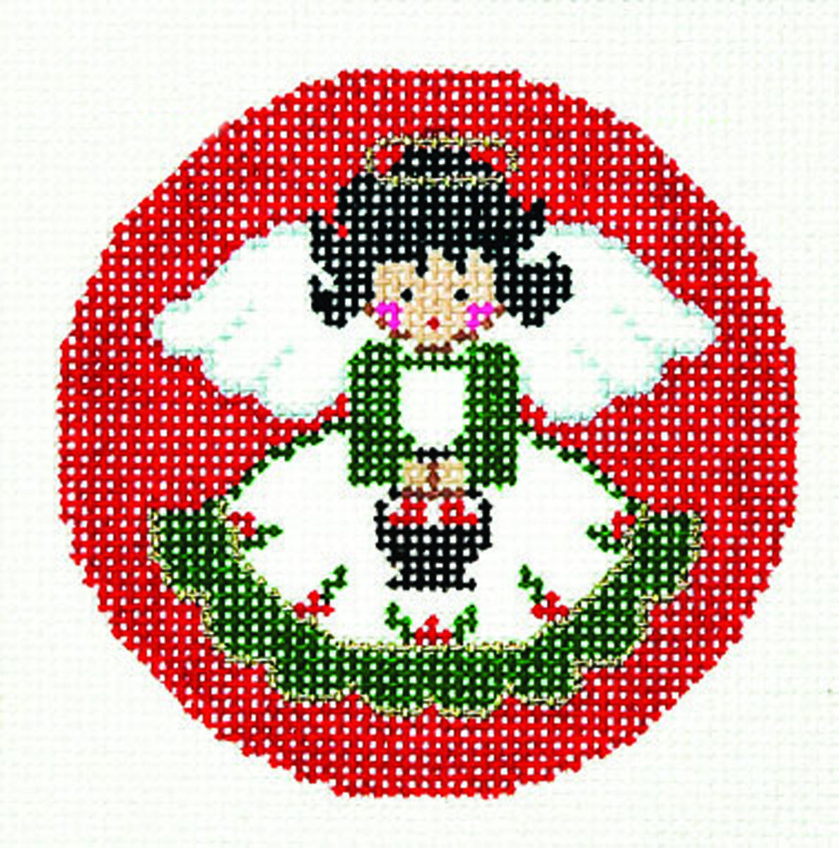 Round ~ Christmas Angel in Green & White handpainted 3" Rd. 18 Mesh Needlepoint Canvas Ornament by LEE