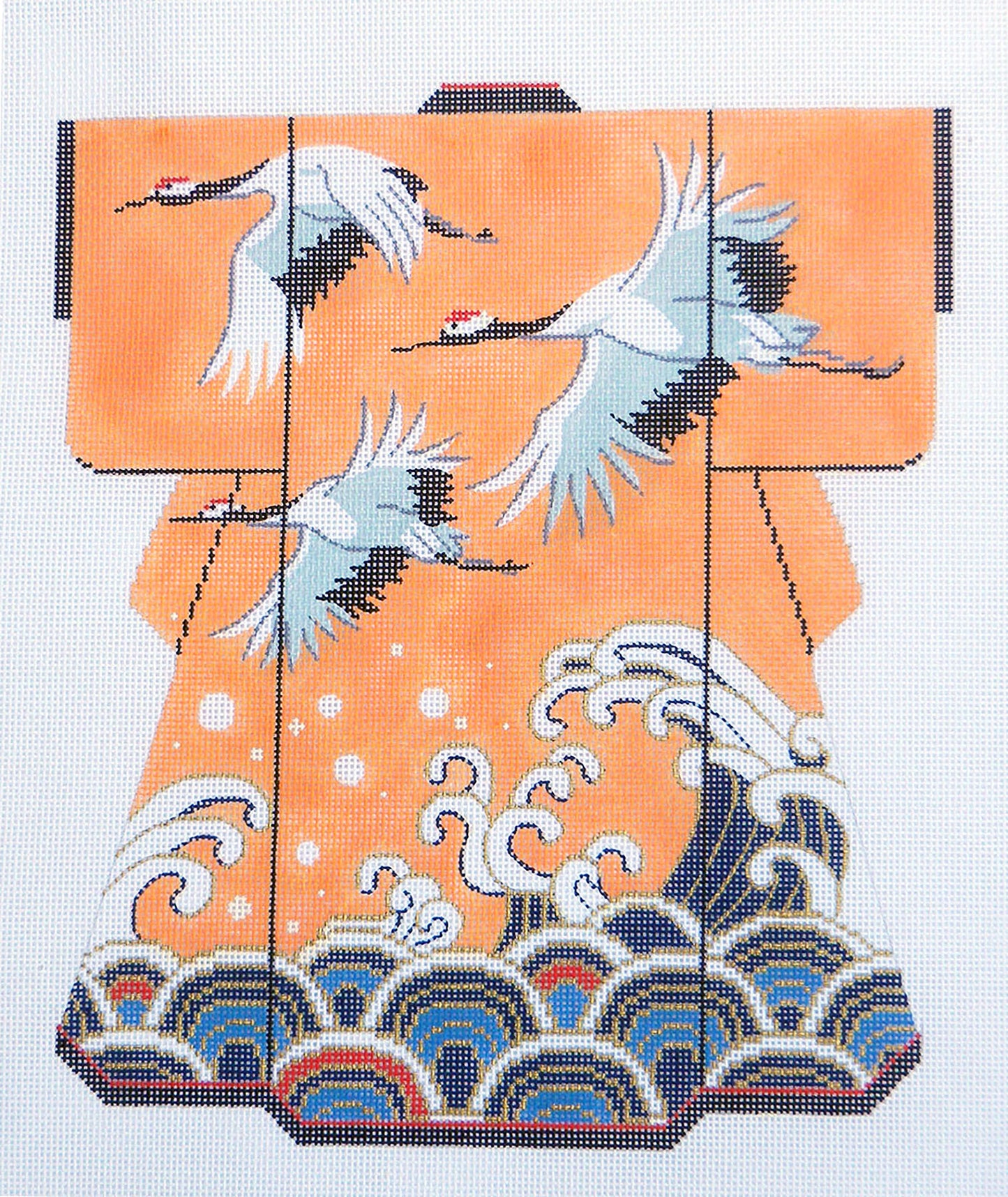 Kimono ~ Flying Cranes Over Waves on Peach Background LG. Kimono 18 Mesh handpainted Needlepoint Canvas by LEE