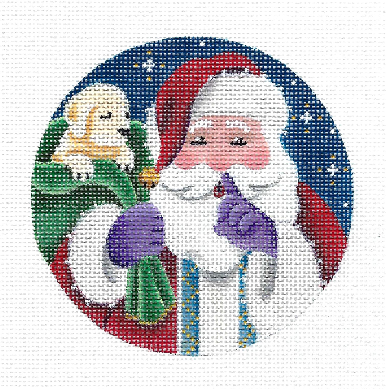 An ADORABLE design, with Santa Carrying a Puppy in his Sack, beautifully hand painted, the design area is 4" Round, with a surrounding canvas area 8.75" Square.