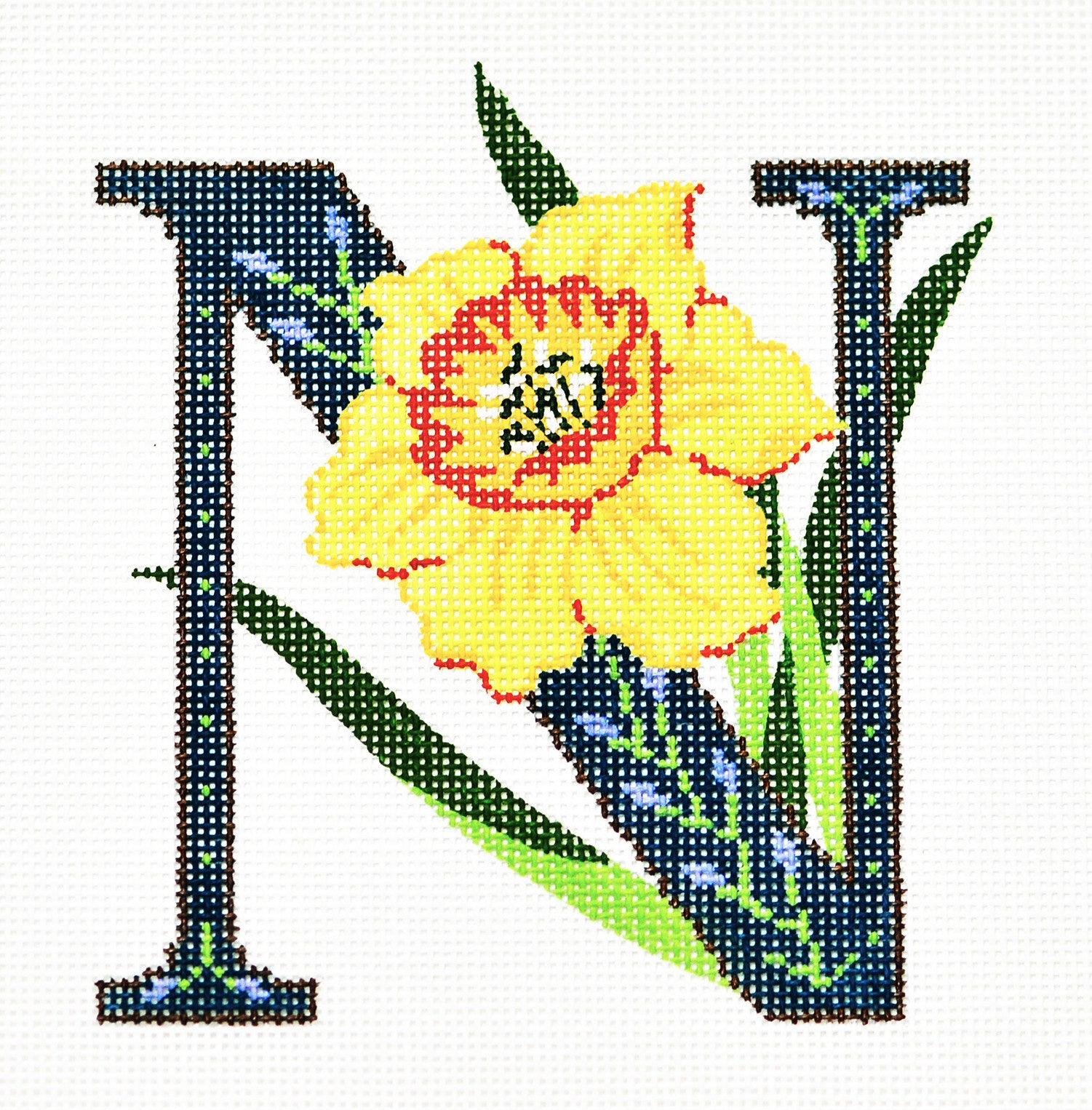 Alphabet Letter ~ N with Floral Yellow Narcissus handpainted Needlepoint Canvas Design by LEE