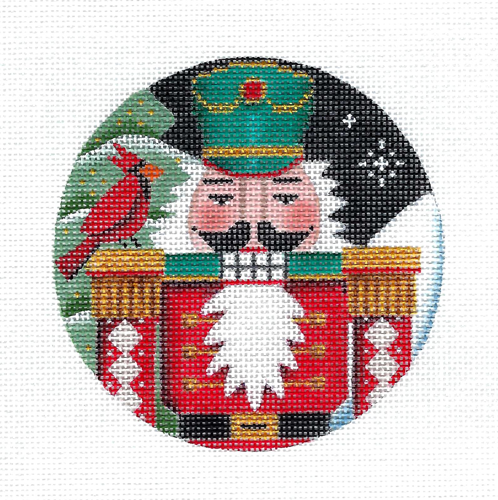 Round ~ NIGHT NUTCRACKER With Cardinal handpainted 18 Mesh 4" Rd. Needlepoint Ornament Canvas by Rebecca Wood