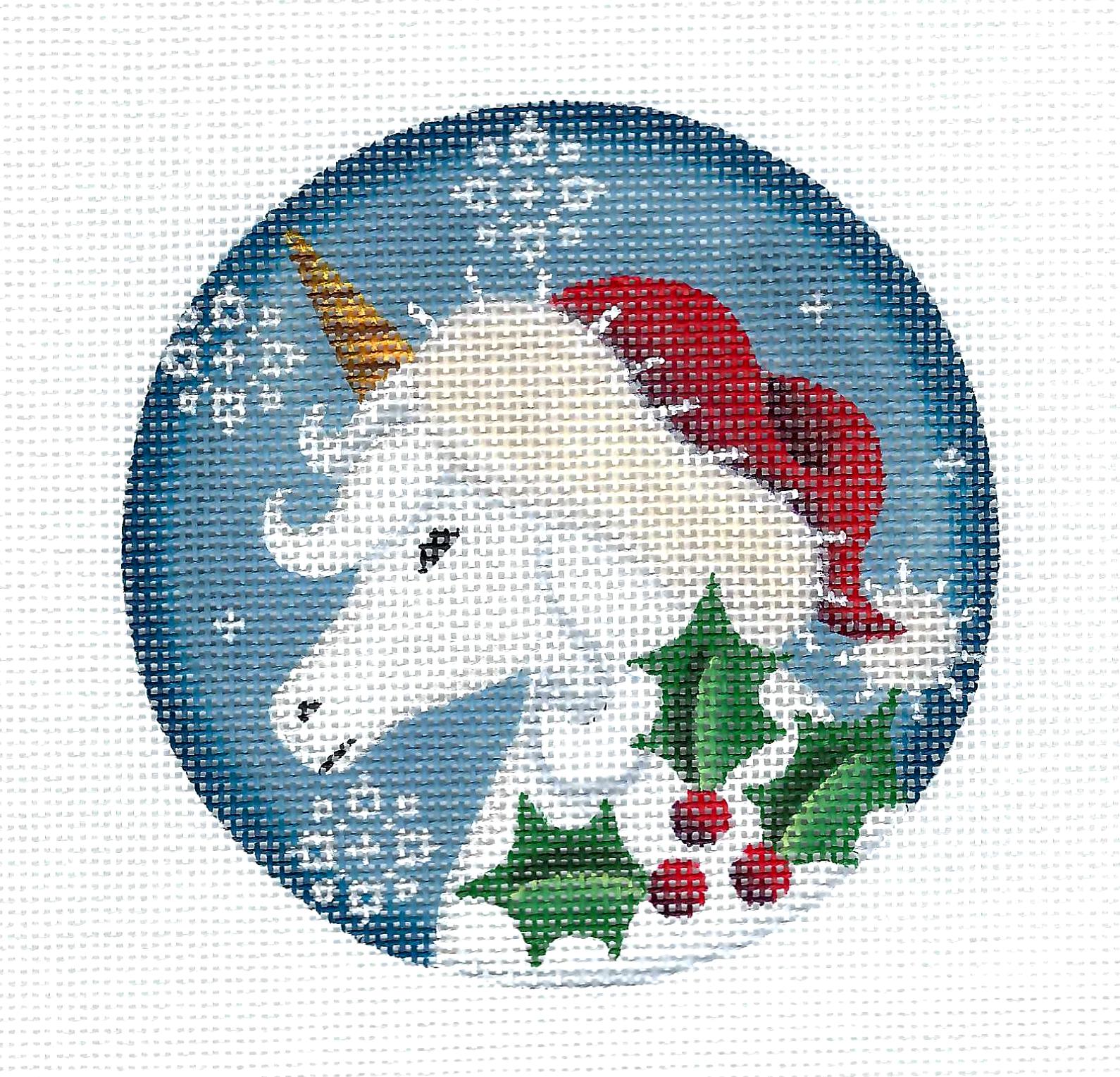 Round ~ CHRISTMAS UNICORN Ornament handpainted 18 Mesh Needlepoint Canvas 4" Round by Rebecca Wood